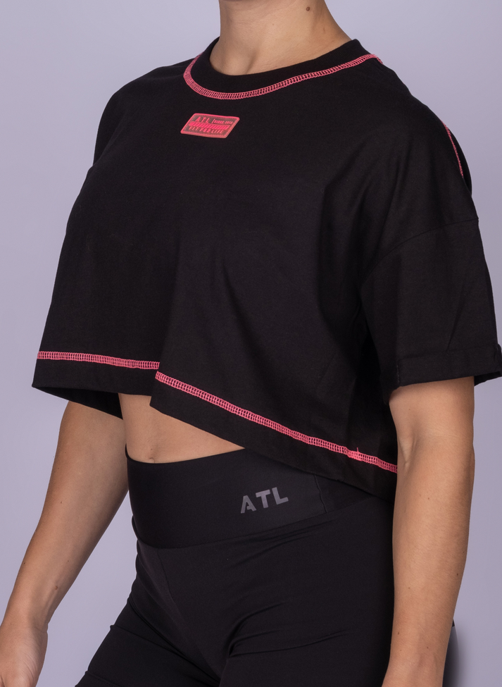 Toda a peça ganha destaque com costuras feitas em rosa pink nos trançadores.