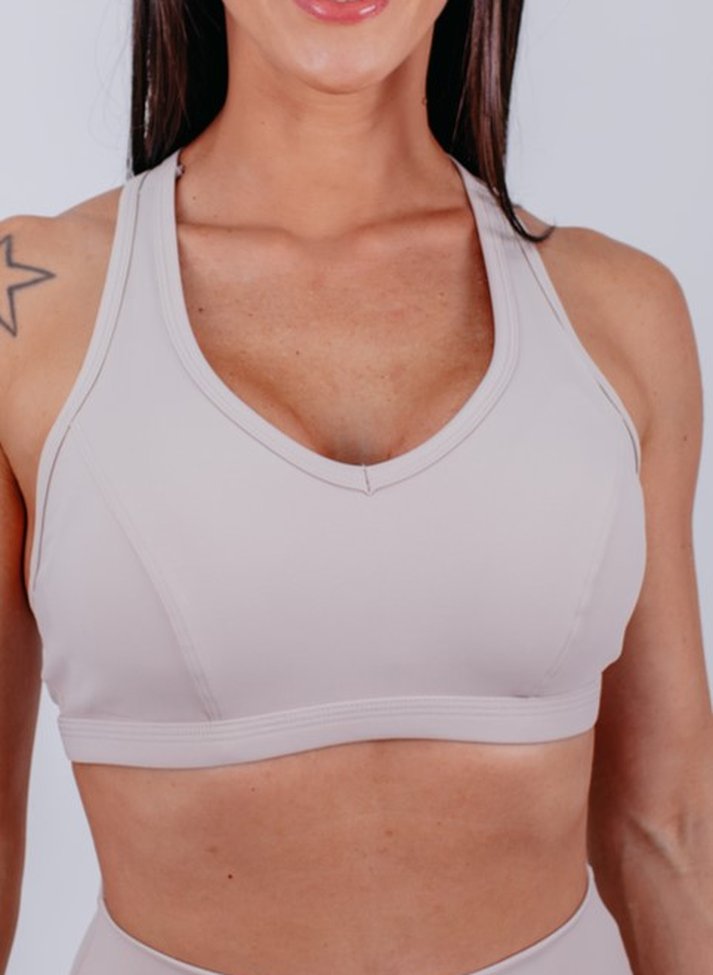 Costas estilo nadador com corte amplo e linhas horizontais oferece suporte superior.