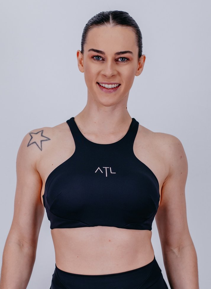 Corte halter com alças altas direciona o suporte para o pescoço.